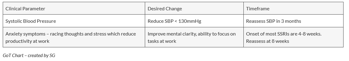 Let's use the example of patient ZY, who has just been diagnosed with high blood pressure and anxiety and their physician has just prescribed Altace and Cipralex. When outlining your Goals of Therapy, we want to establish specific clinical parameters, our desired change in those parameters, and finally a time frame to achieve our goal.